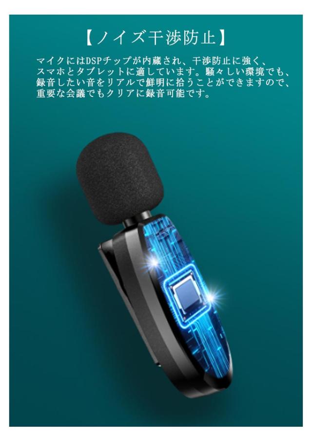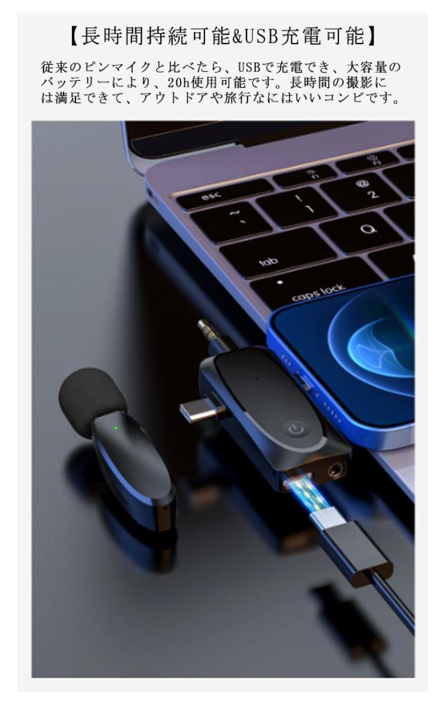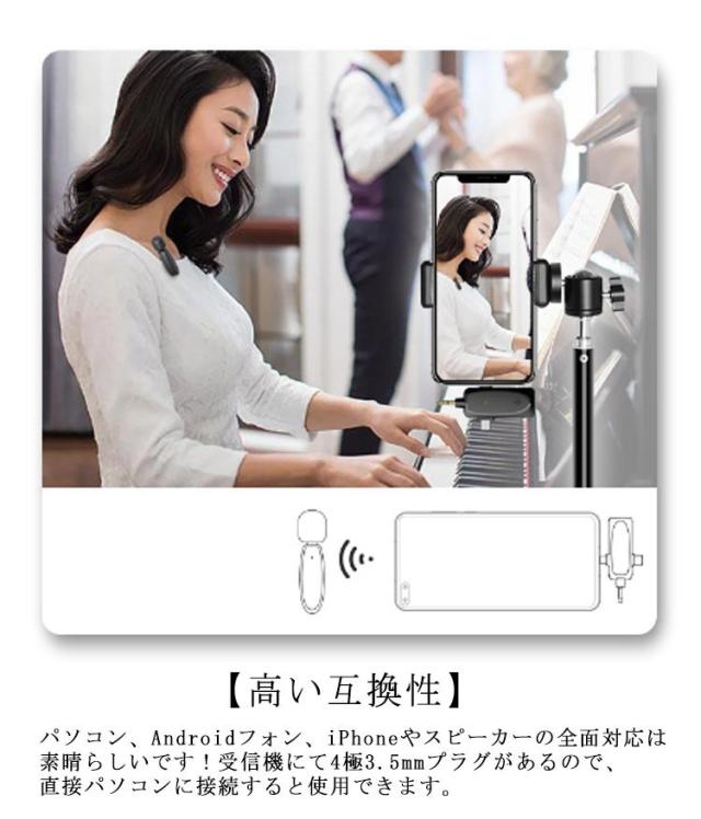 | 【2.4GHzデジタル通信】ワイヤレスマイクは2.4G伝送テクノロジーを使用するので、信号は120メートル以内でより安定して伝送します。 【APP不要 操作簡単】最新の技術で、送信機と受信機が自動的に無線接続されます。専用APPやBluetoothは必要なく、受信機をデバイスに挿すだけですぐに使えます。 【360°に集音】高品質の全指向性マイクで、全方位からの音声をより豊かに収録できます。ビデオ会議、ユーチューブ、生放送、取材録音、カメラ録画などのシーンでよく使われます。 【ノイズ干渉防止】マイクにはDSPチップが内蔵され、干渉防止に強く、スマホとタブレットに適しています。騒々しい環境でも、 録音したい音をリアルで鮮明に拾うことができますので、重要な会議でもクリアに録音可能です。 【高い互換性】パソコン、Androidフォン、iPhoneやスピーカーの全面対応は素晴らしいです!受信機にて4極3.5mmプラグがあるので、直接パソコンに接続すると使用できます。PCでオンライン会議やオフィスを行うことが全然問題なし!Android&iPhoneアダプターが付属するので、type-cポートがあるAndroidフォンとiPhone/iPadに適用して、気軽に録音または録画を実現できます。 【遅延なし】リアルタイム自動同期技術を採用したワイヤレスピンマイクは、音声遅延によるビデオの後編集を大幅に削減します。 【様々なシーンで活躍】iPhoneなどの外付けマイクとして、ライブ配信、動画撮影、授業、司会、演奏、インタビューなどにも大活躍です。 【長時間持続可能&USB充電可能】従来のピンマイクと比べたら、USBで充電でき、大容量のバッテリーにより、20h使用可能です。長時間の撮影には満足できて、アウトドアや旅行なにはいいコンビです。 | |