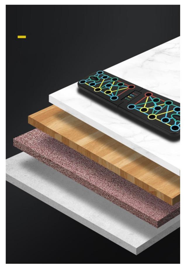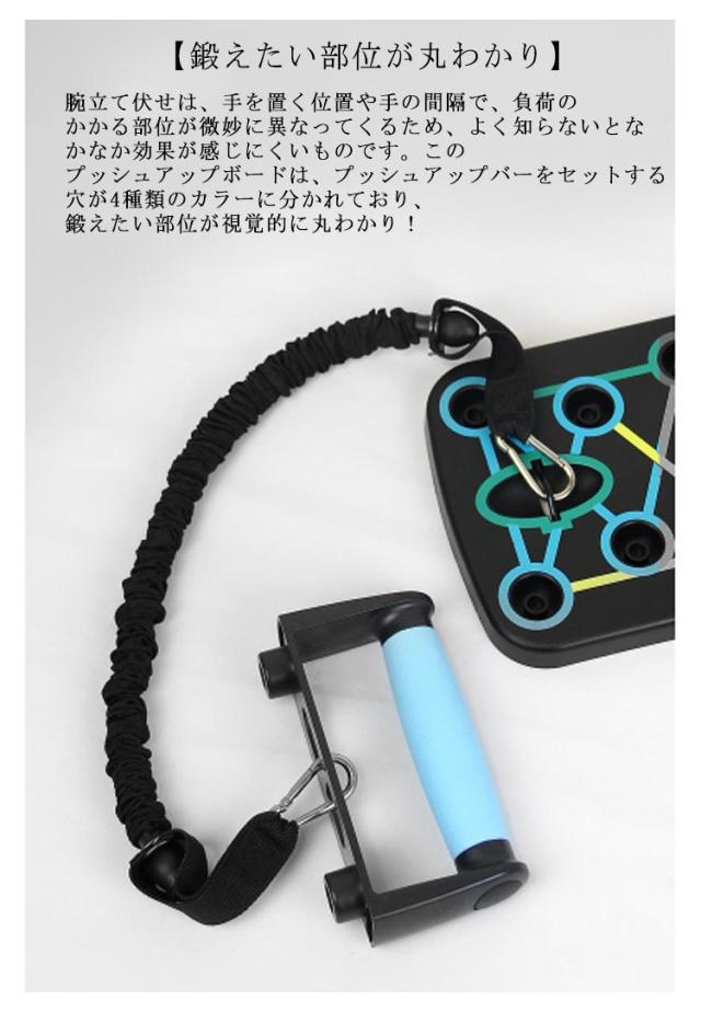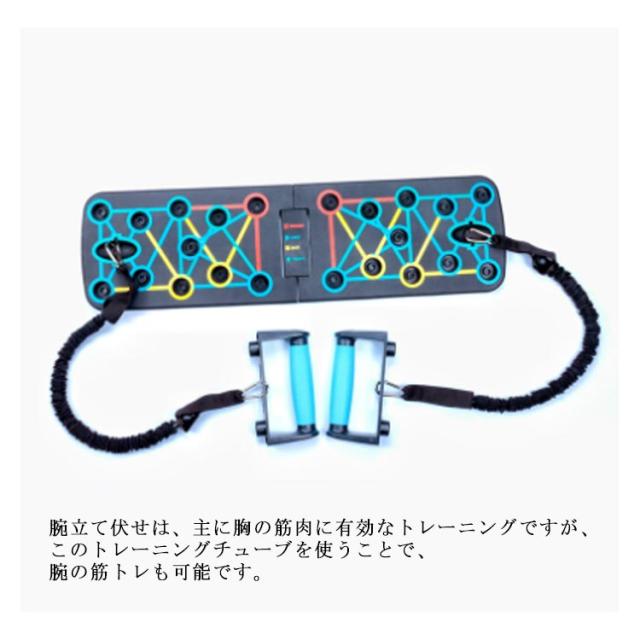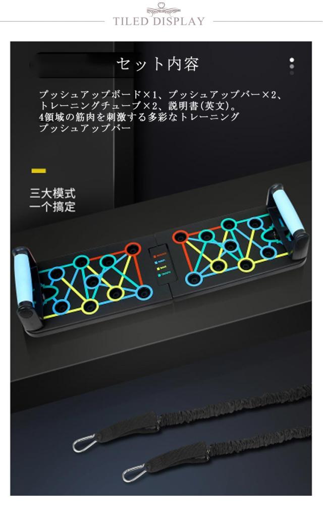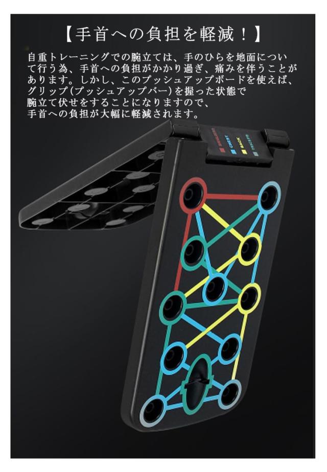 | セット内容:プッシュアップボード×1、プッシュアップバー×2、トレーニングチューブ×2、説明書(英文)。 4領域の筋肉を刺激する多彩なトレーニング プッシュアップバー 【手首への負担を軽減!】自重トレーニングでの腕立ては、手のひらを地面について行う為、手首への負担がかかり過ぎ、痛みを伴うことがあります。しかし、このプッシュアップボードを使えば、グリップ(プッシュアップバー)を握った状態で腕立て伏せをすることになりますので、手首への負担が大幅に軽減されます。 【鍛えたい部位が丸わかり】腕立て伏せは、手を置く位置や手の間隔で、負荷のかかる部位が微妙に異なってくるため、よく知らないとなかなか効果が感じにくいものです。このプッシュアップボードは、プッシュアップバーをセットする穴が4種類のカラーに分かれており、鍛えたい部位が視覚的に丸わかり! プッシュアップバーの位置を切り替えるだけで、刺激する筋肉を手軽にコントロール! 筋トレを始めたばかりの初心者の方や、これから始めようとしている方にも分かりやすく、効率的にトレーニングすることができます。 BLUE AREA(ブルーエリア):胸(大胸筋) RED AREA(レッドエリア):肩(僧帽筋) YELLOW AREA(イエローエリア):背中(広背筋) GREEN AREA(グリーンエリア):腕(三角筋、三頭筋) 【腕の筋トレにトレーニングチューブも付属!】腕(三角筋、三頭筋)のトレーニングに効果的なトレーニングチューブ(トレーニングゴム)が付属します。腕立て伏せは、主に胸の筋肉に有効なトレーニングですが、このトレーニングチューブを使うことで、腕の筋トレも可能です。 【手に馴染むグリップ】プッシュアップバーはグリップ部分をラバーコーティングして滑りにくい設計となっております。手が滑ってしまっては、手首を痛めてしまう可能性も有り、せっかく手首への負担が軽減されても意味がありません。しっかりと握ることで、筋肉への刺激に集中してトレーニングを行う事が可能です。 【コンパクトに収納可能】使用後は半分に折りたたんで、コンパクトに収納することが可能です。旅行先、出張先のホテルや、遠征先の合宿所など、部屋に持ち込む際に嵩張りません。また、公園などちょっとした広場があれば、どこにでも持ち運ぶ事ができるので、欠かさずトレーニングすることができます。 | |