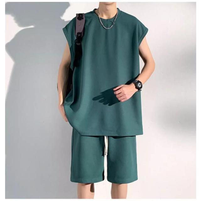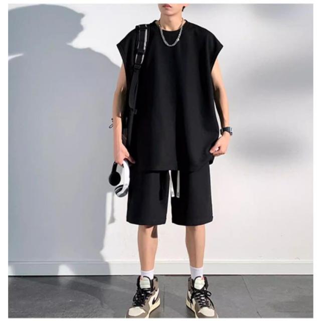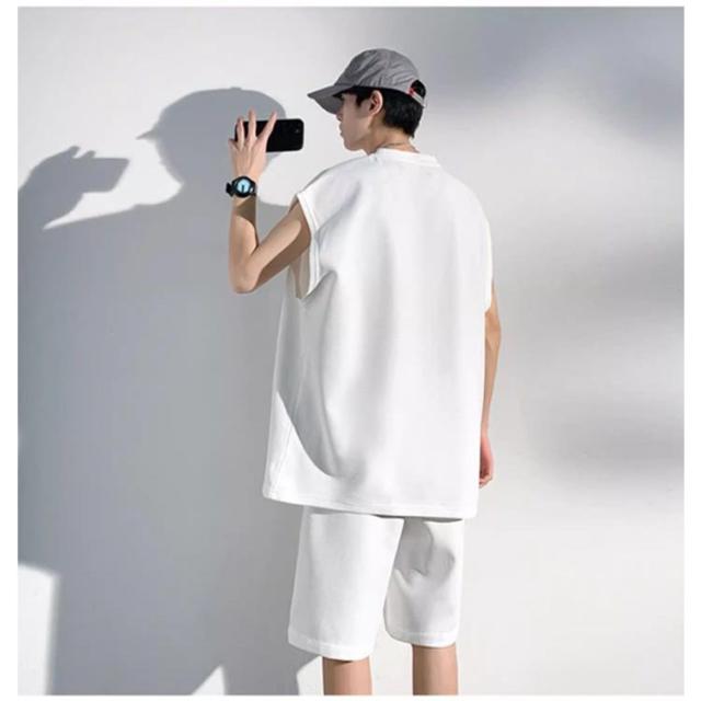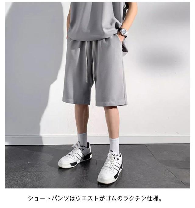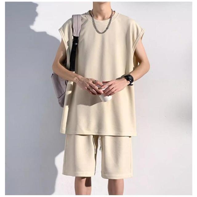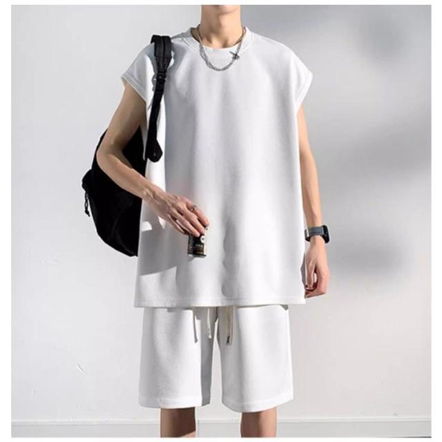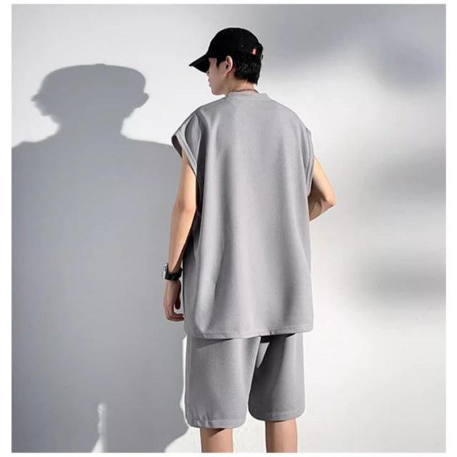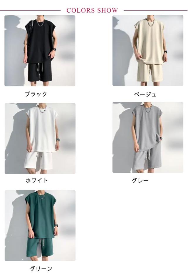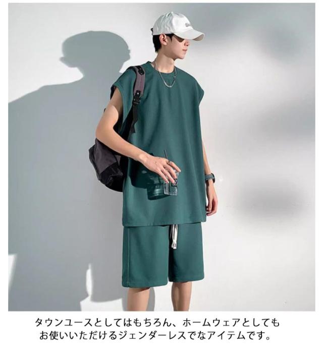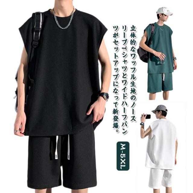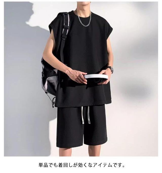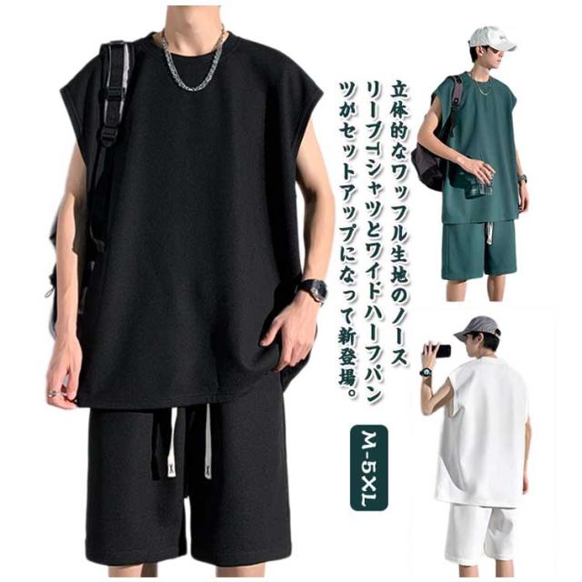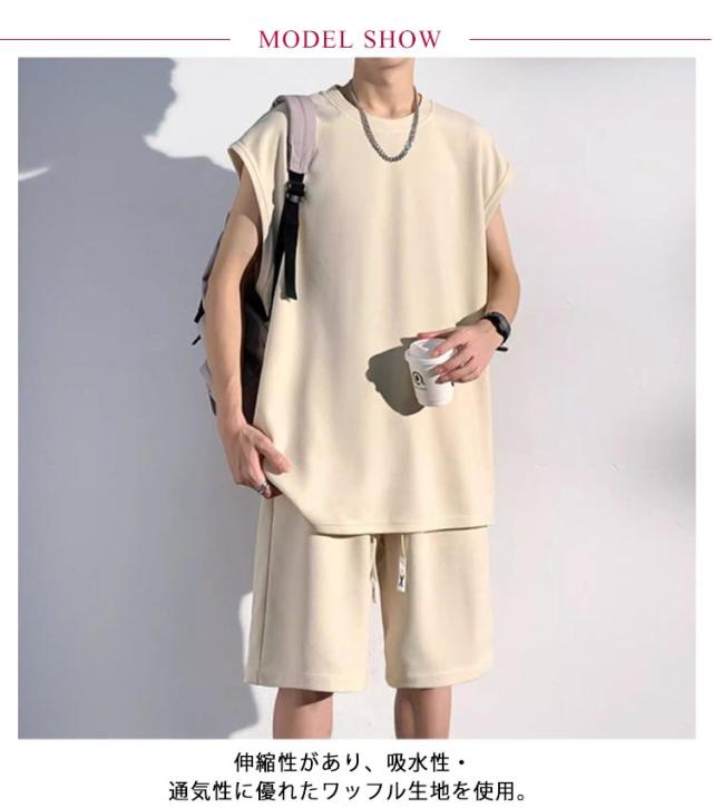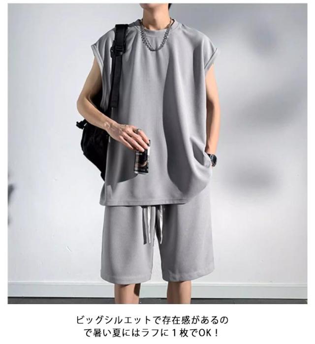 夏 セットアップ メンズ ノースリーブ Tシャツ ショートパンツ ワッフル タンクトップ 上下セット オーバーサイズ カジュアル おしゃれ 大きいサイズ 薄手 ゆったり 袖なし カットソー 短パン ハーフパンツ 上下 2点セット 夏用 ルームウェア 部屋着 無地 シンプル 【送無】