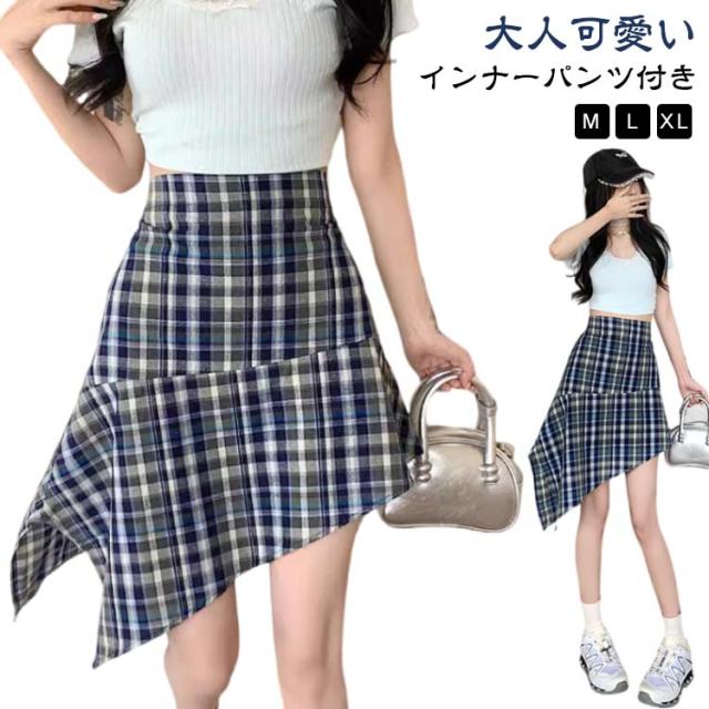 スカート 膝丈 大きいサイズ 裏地付き 裏地付き ダンス アシンメトリー ひざ丈 アシメ 春夏 ボトムス フレアスカート インナーパンツ付き 衣装 韓国ファッション 個性的 ゴルフウェア チェック柄 大人女子 レディース