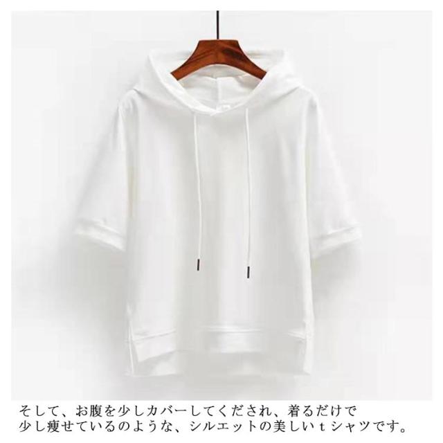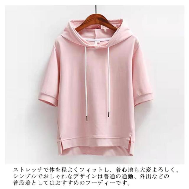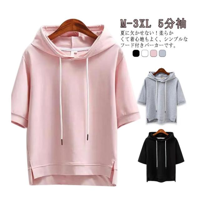 夏パーカー パーカー フード付き レディース フード付きtシャツ 薄手 5分袖 半袖プルオーバー 無地 シンプル カジュアル ゆったり コットン 綿 トップス tシャツ スリット 学生 通学 夏 送料無料