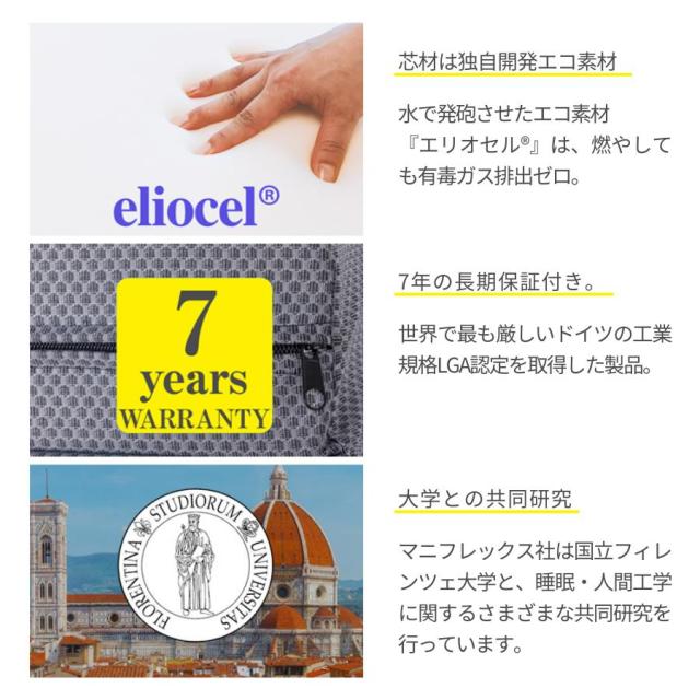 イタリア生まれの熟睡寝具、マニフレックスは、創業60年以上の歴史をもつ寝具ブランドで、世界99ヵ国以上に輸出され世界中の人たちに愛されています。 マニフレックスは、スプリングゼロ・プラスチックゼロ・有毒ガスゼロ・3つのゼロで人と地球にやさしい寝具です。 長年の研究の末に開発された「エリオセル」の構造が、スプリングやプラスチックを使用しなくても高反発性を備えることを可能にしました。 横たわると、背中・腰・お尻にかけての自然なカーブに沿って体全体を受け止め、適度な反発力でしっかりと支え上げます。 「エリオセル」は水を基に発泡させる次世代高反発フォームであり、生成過程においても人体や地球環境に有害な物質を使用せず、また、燃焼させても有毒なガスが発生しません。 「エリオセル」は温度変化に強く1年を通して変わらない寝心地でお休みいただけます。オープンセル分子構造で、まるで呼吸をするかのように通気性がよく、耐久性にも優れており、ドイツの検査機関「LGA GERMANY」の厳しい耐久性テストをクリアしています。 高反発と優れた耐久性・通気性を持った「エリオセル」だから、 真空ロールパッケージ が可能に。体積を1/8にまで圧縮することで、輸送コストだけでなく 温室効果ガスの大幅な削減 にも貢献しています。 |