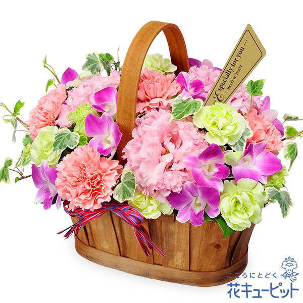 優しいピンクのトルコキキョウが映える、爽やかなアレンジメントです。人気のウッドバスケットに詰めて、ナチュラルなギフトに仕上げました。誕生日プレゼントやお祝いのプレゼントにおすすめです。