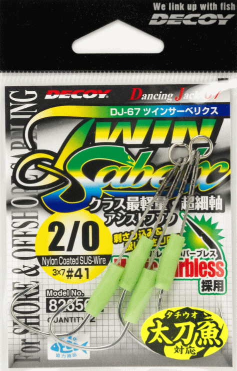 カツイチ DECOY Twin Sabelx 太刀魚 タチウオ サーベリング メタルジグ ルアー アシスト フック バーブレス並の貫通力と、ストッパーによるキープ力を両立するマジックバーブレス採用の「AS-07 サーベリクス」を使用。鋭い歯に切られる心配のないワイヤーを使用し、フックを段差にセッティングした太刀魚ジギング特化型アシストフックです。チモトに夜光チューブを配し、効果的に太刀魚のバイトを捕らえ、船上でのフックリリースも容易にすることで数釣り・大型狙いの両方が楽しめるサーベリング専用アシストフックです。 入数:2 |