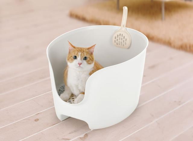 高い壁とステップで猫砂が飛び散りにくい、おしゃれな猫トイレ。固まる猫砂用。