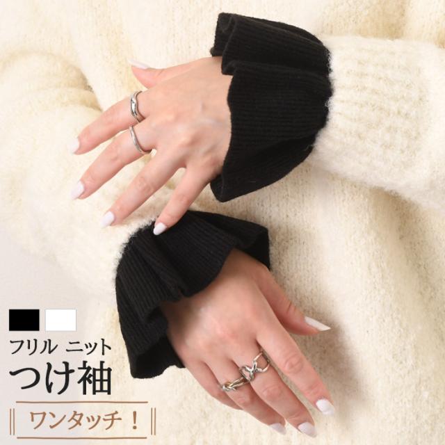 新作 シンプル フリル やわらか ニット つけ袖 レディース 手首 フレア袖 アクセサリー 小物 暖かい あったか 柔らかい おしゃれ かわいい 上品 きれいめ 華やか エレガント 大人 デイリー ホワイト ブラック ワンタッチ
