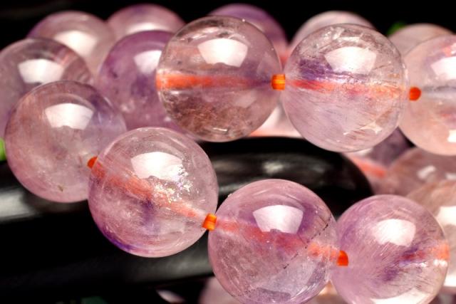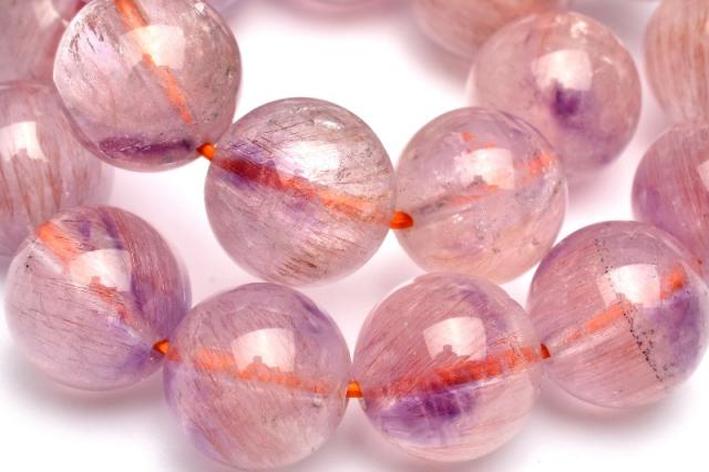| 特徴・意味 | 細い繊維状のゲーサイトやレピドクロサイトが濃密に内包されたピンク色の可愛らしいスーパーセブンです。 非常に高品質なので水晶の透明度も高く、内包物をじっくり観察することができます。 アメジストのパープルも随所に入り、春の花々のような華やかさがあります。 ここまで統一のサイズとカラーで作られるブレスレットは稀です。 これからの時期にぴったりな華やかなカラーでとてもオススメです。 パワーストーンの定番アメジストに、細かなゲーサイトやレピドクロサイトが入っているアメジストスーパーセブンです。 スーパーセブンとは、水晶にアメジスト・スモーキークォーツ・カコクセナイト・ルチルクオーツ・ゲーサイト・レピドクロサイトなどが内包された鉱物の通称名です。 肉眼で7種類の鉱物を全て確認できる事は非常にまれですが、7つの鉱物が内包された状態の原石をカットし、加工した石もスーパーセブンと呼ばれます。 |