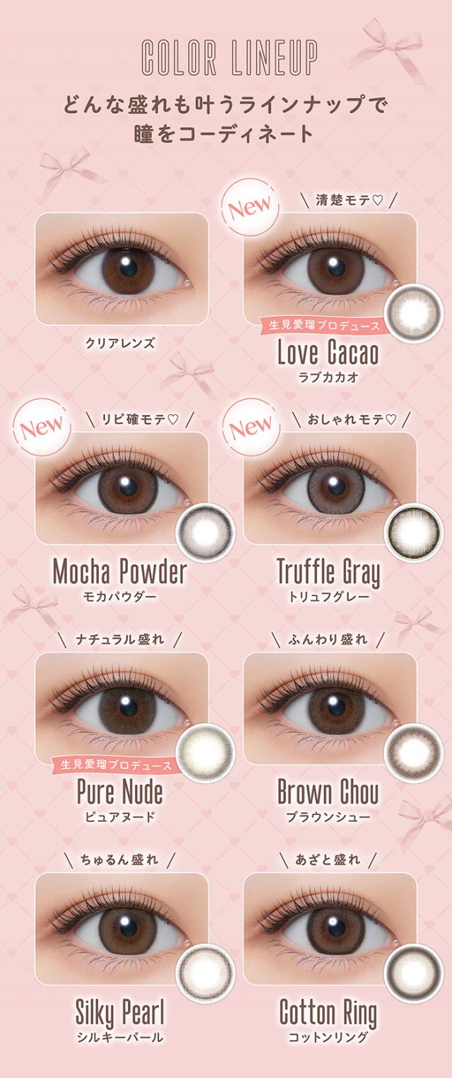 | 着色直径 | 13.0mm:ラブカカオ 13.2mm:ピュアヌード 13.4mm:トリュフグレー 13.5mm:シルキーパール/コットンリング 13.6mm:モカパウダー/ブラウンシュー |