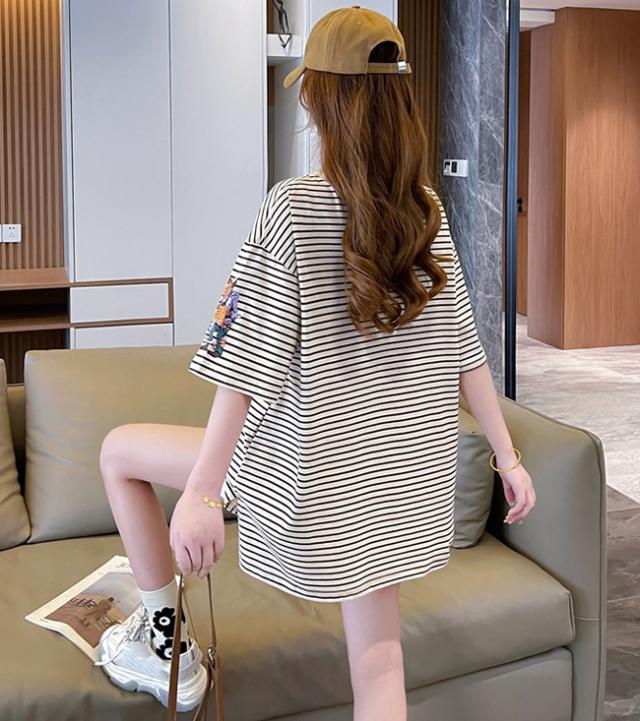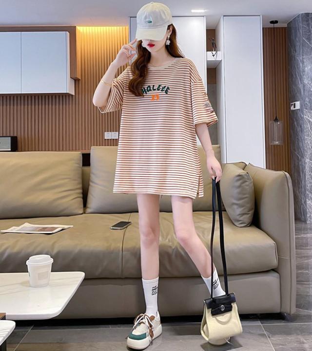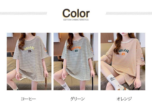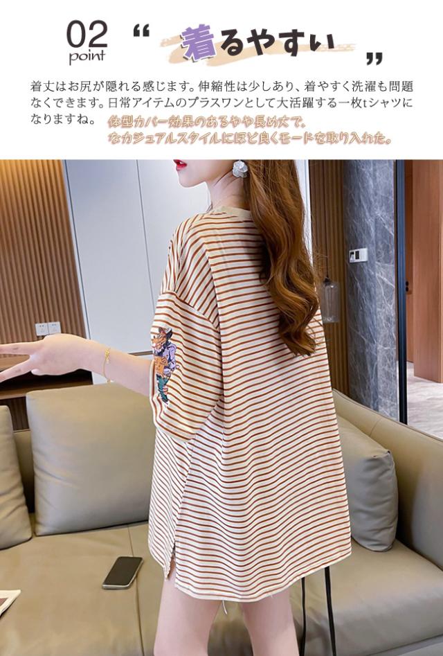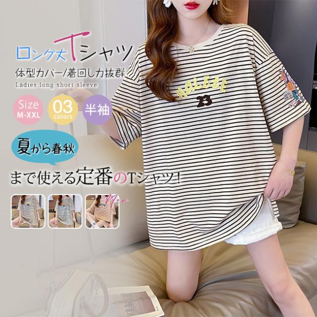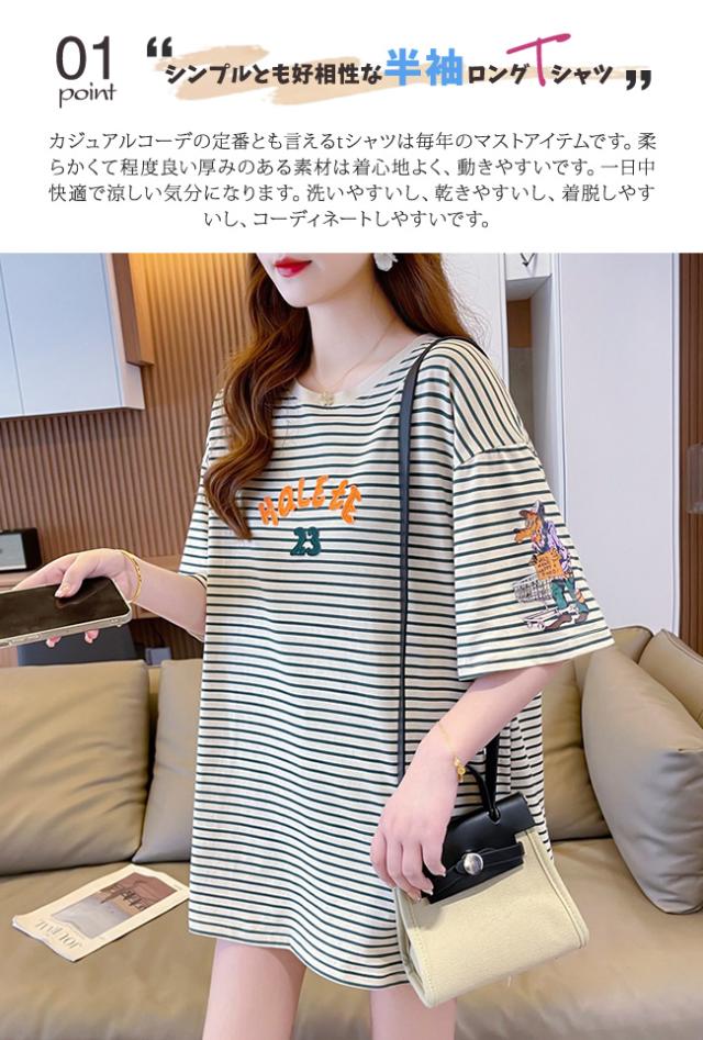 ボーダーtシャツ レディース ロンT ロングtシャツ 半袖 トップス 夏 大きいサイズ おしゃれ プルオーバー クルーネック ゆったり 快適 カジュアル