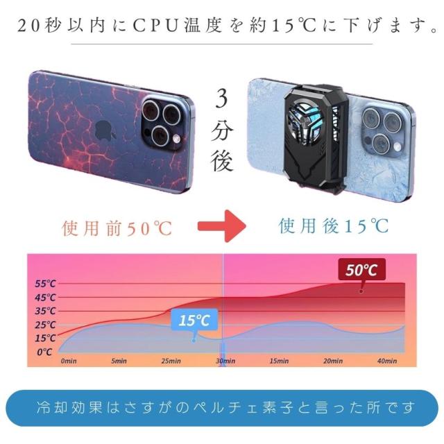 - ファンだけでなく、ペルチェ素子がついているのでスマホがよく冷えます。