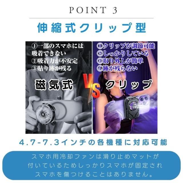 クリップ式で簡単に取り付けられるこの冷却ファンは、4.7インチから7.3インチまでのスマホに対応しています。伸縮式クリップにより、どんなデバイスにもピッタリとフィット。スマホのサイズを気にせず、いつでもどこでもお使いいただけます。