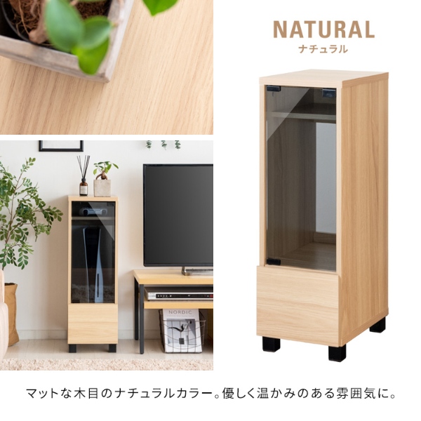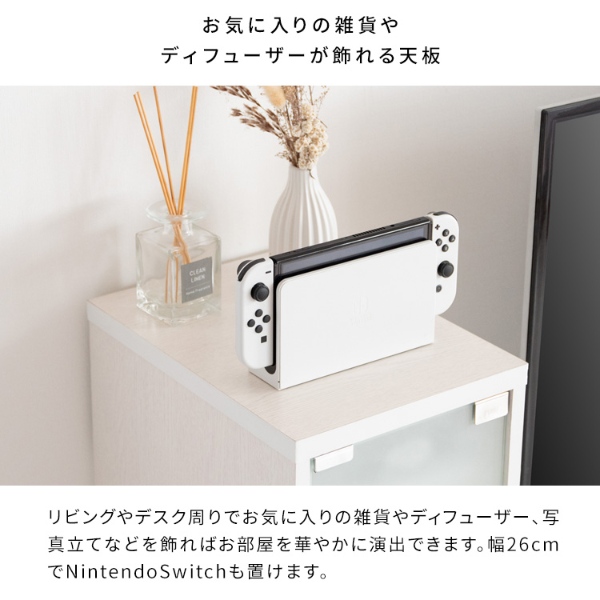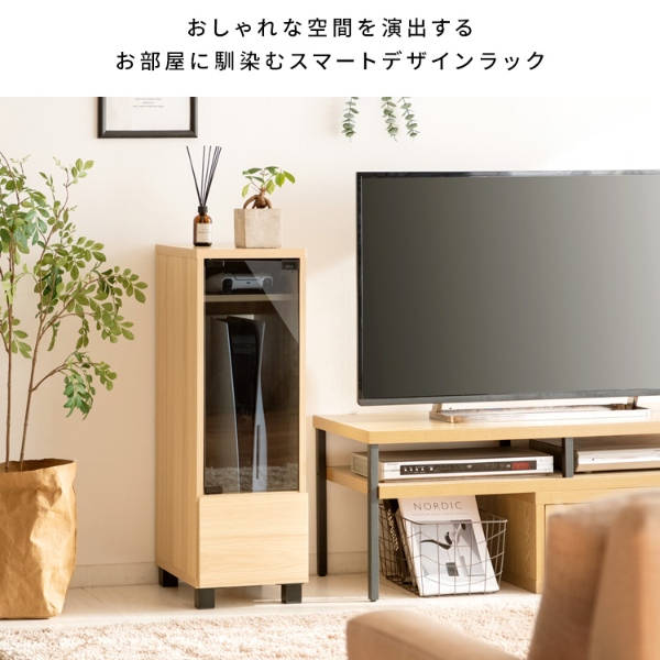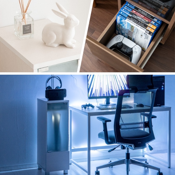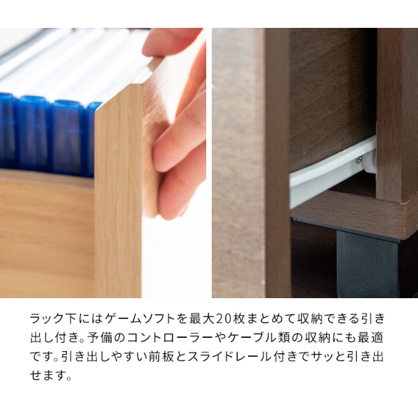 PS5など据置型ゲーム機が縦にピッタリ収まるラックはガラス扉になっており、ゲーム機を隠してホコリの侵入を防ぎます。背面はオープン仕様で放熱対策もバッチリ。雑貨がディスプレイできる天板やコントローラーの収納棚、ゲームソフトが最大20枚収納できる引き出し付きでゲーム機周りをスッキリ。
