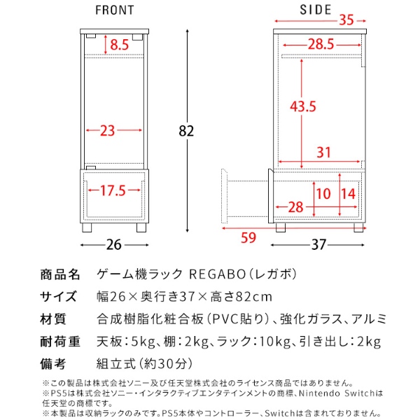 カラー ナチュラル 商品名 ゲーム機ラック REGABO(レガボ) サイズ 幅26x奥行き37x高さ82cm 材 質 合成樹脂化粧合板(PVC貼り)、強化ガラス、アルミ 耐荷重 天板:5kg、棚:2kg、ラック:10kg、引き出し:2kg 備 考 組立式(約30分) ※この製品は株式会社ソニー及び任天堂株式会社のライセンス商品ではありません。 ※PS5は株式会社ソニー・インタラクティブエンタテインメントの商標、Nintendo Switchは任天堂の商標です。 ※本製品は収納ラックのみです。PS5本体やコントローラー、Switchは含まれておりません。 ※お客様組立て品につきましては、組み立て後に不良の連絡をされても対応ができません。組み立て前にパーツに不良・傷等がないか、必ずご確認下さいますようよろしくお願い申し上げます。 ※記載は商品仕様の一部です。仕様説明不足等の理由での返品はできません。特に適合等は必ずご確認ください。