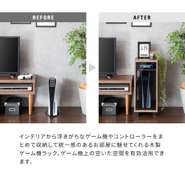 PS5など据置型ゲーム機が縦にピッタリ収まるラックはガラス扉になっており、ゲーム機を隠してホコリの侵入を防ぎます。背面はオープン仕様で放熱対策もバッチリ。雑貨がディスプレイできる天板やコントローラーの収納棚がありゲーム機周りをスッキリ。