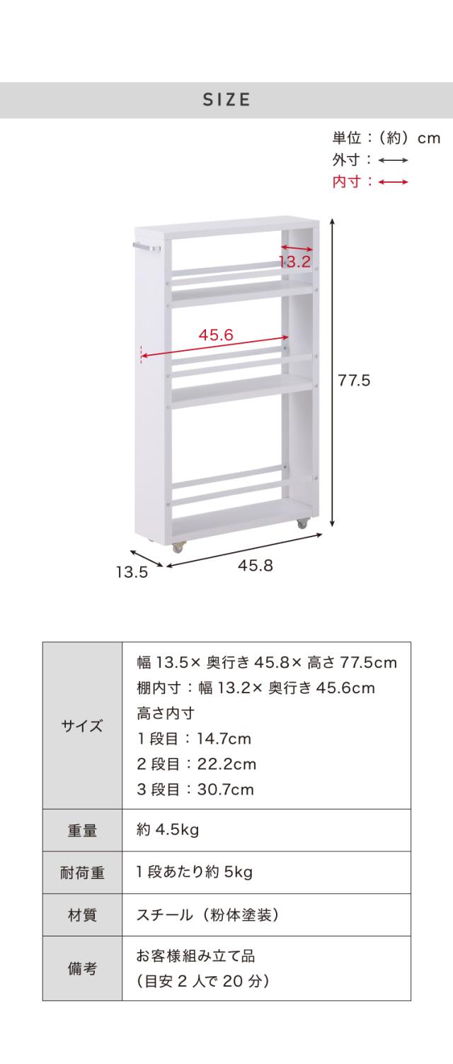 キャスター付き スチール製すき間収納 ロータイプ 幅13.5cm