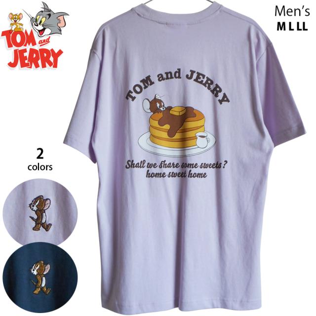 送料無料 トムとジェリー メンズ Tシャツ M L LL 半袖 刺繍 バックプリント Tom&Jerry 大きいサイズ パンケーキ ホットケーキ アメコミ レディース ビッグ ペアルック レトロ コミック 80年代 男女兼用 かわいい 春夏 ラベンダー パープル ネイビー 古着風デザイン