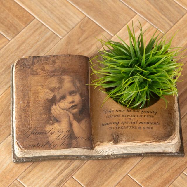 アンティーク調の洋書をモチーフにしたプランターです。お気に入りのオーナメントと組み合わせて箱庭やミニチュアガーデン作りも楽しめるアイテムです。