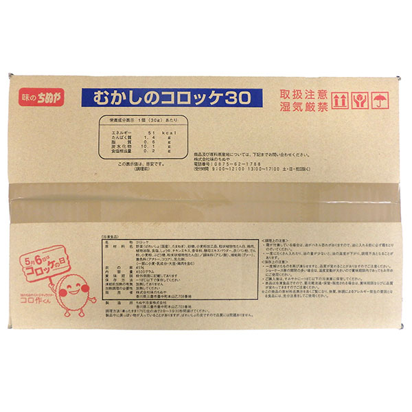 | 味のちぬやの看板商品。 しっかりと下味を付けた国産鶏肉が入ったむかしなつかしい味付けのコロッケです。 30gサイズ(大きさの目安:7cm×5cm×1.5cm) 大量調理に最適な1箱150個入りの業務用商品です。 製品中に黒っぽいものが入っていることがありますが、ばれいしょの皮ですので品質には問題ありません。 |