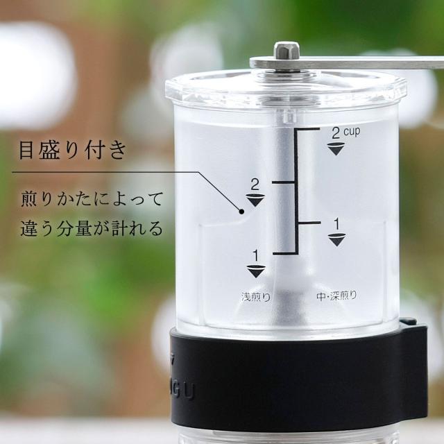分量の目安となるコーヒー豆の目盛り付き!お好みの豆を目盛りまで入れてあとはクルクル回すだけ。ミル部はセラミックで、金属臭がなくコーヒー本来の風味を損ないません。また摩耗しにくい為、使い始めの挽き具合が持続します。粗さ調節ネジでドリップ方式に合わせた粗さを選べます。セラミックミル部は取り外し、水洗いができます。目盛りは浅煎り・中深煎りと分かれています。