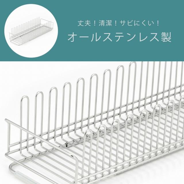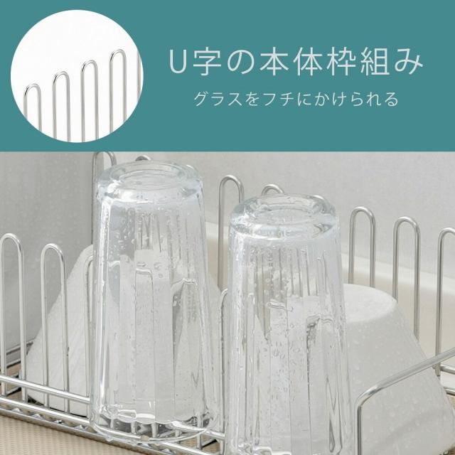 ![]() | お皿を立てて水切りできる U字の本体枠が新しい! U字型のワイヤーを組み合わせて作られた本体枠。ワイヤーのすき間にお皿を垂直に立てることができます。大きなお皿も安定して立てられ、垂直に立つから水切れも良く乾きも早い! |