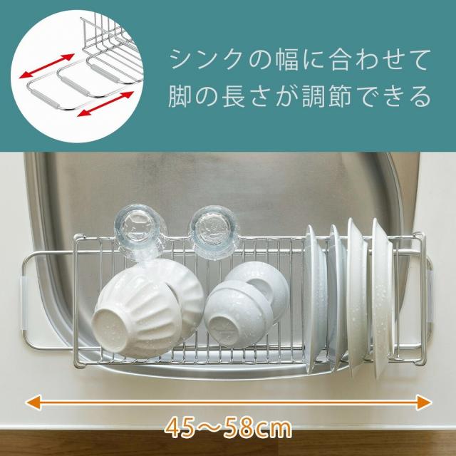 シンク上に58cm幅まで脚を伸ばして置けます。本体枠組みはU字にすることで大皿もきっちりおさまり、垂直に立てられ水切りが早い。さらにコップはフチに掛けることができます。食器収納目安2〜3人。