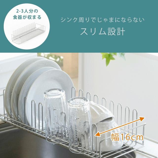 ![]() | 場所を取らずに スリムに置ける 幅16cmとスリム設計。シンク上に設置しても作業のじゃまになりません。スリムでも2〜3人分の食器が収まります。 |