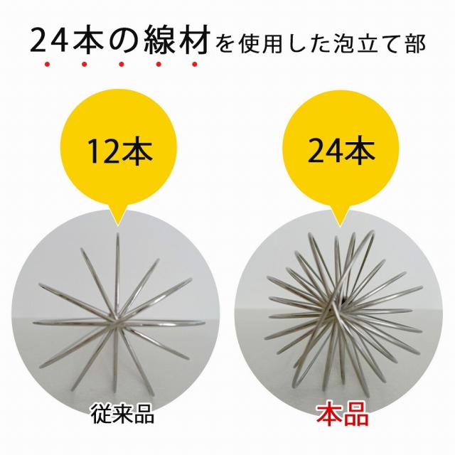 ![]() | プロ仕様! ケーキ屋さんも愛用 とにかく泡立てが早い 線材の数は多いほど泡立ちが早い。この泡立て器は24本の線材でできています。なめらかに泡立ち、ダマにならずに素早く混ぜることができます。 |