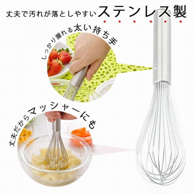 ![]() | ステンレス製の丈夫な作り しっかり握れる太めの持ち手で泡立て作業がしやすい。ステンレスの丈夫な素材と丈夫な作りで、ポテトマッシャーとしても使えます。 |