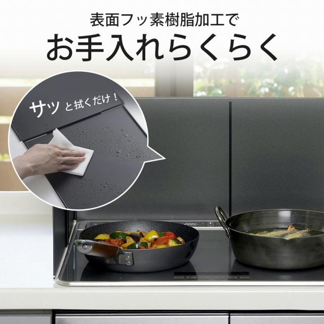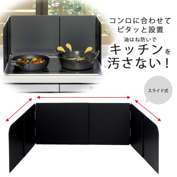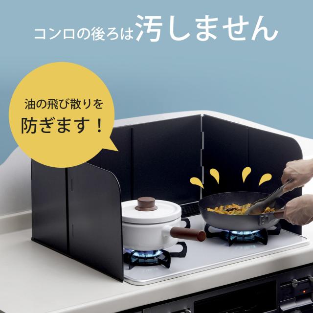 コンロの周りにピタッと設置 立てるだけで 油の飛び散りガード スライド調節でかんたん設置。ご使用のコンロの周りを囲んでしっかりガードします。小さく縮めてコンパクトに使うこともできます。汚れる前に油汚れからガードして、コンロ周りはもう汚しません。 | ![]() |