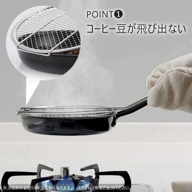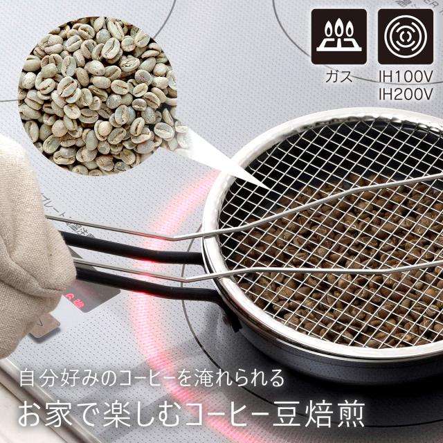 IH調理器・ガスコンロでコーヒー生豆の焙煎ができます。生豆を焙煎するとエグ味のもととなる薄皮が剥がれますが、付属の網をフライパンにかぶせ、逆さにして振ることで簡単に薄皮を取り除けます。※火にかけるとフライパンや網の取っ手が大変熱くなりますので、必ずミトンを着けてご使用ください。