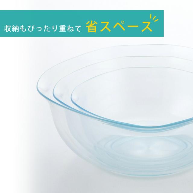 まるでガラス!落としても割れにくい耐熱200℃の樹脂製になります。料理の下ごしらえや電子レンジでの温野菜等に、ひっくり返してフードとしても使用できます。透明なので食材も見やすい。綺麗な器のような形状と透明感。食卓でのサラダボールや、夏はそうめん入れにも。ガラスに比べ軽いから扱いもラクラク。食洗機の洗浄も可能。3個重ねて収納できます。