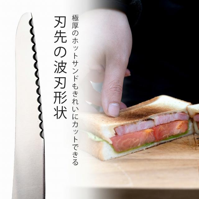 ![]() | 波刃でホットサンドも やわらかい食パンも つぶさずカット 先端は刃渡り8.8センチの波刃形状。具沢山のホットサンドにも、中身をつぶすことなくスッと刃が入ります。硬いパンや焼きたてのやわらかいパンももちろんするどく切り込みキレイにカットできます。 |