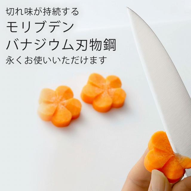 切れ味の衰えにくい ステンレス包丁 刃が薄いから、野菜や果物の皮も薄くむきやすい。小回りもきくから細かい作業にも。いつもの料理も飾り切りのひと工夫で、美味しそうに仕上がります。 | ![]() |