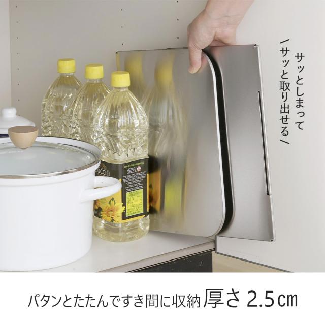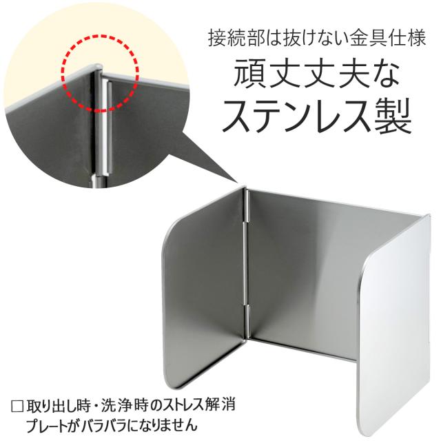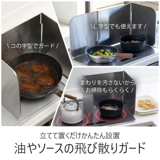 丈夫なステンレス製ガード。料理の油はねやアウトドアで使用する時の風よけに。いため料理をすると、広範囲に油がはねてお掃除が大変、そんな悩みを解消します。使い方はかんたん、調理前にレンジガードを立てるだけ。終わったらパタンとたたんですき間に収納。折りたたみ時(約)2.5cm厚になるのですき間に入れておけます。折りたたみ式だから持ち運びもしやすい。接続部の金具を改良しました。金具を抜けなくしたため、出し入れや洗浄時にバラバラになることがありません。※天板が平面のビルトインガスコンロとIH調理器に使えます。