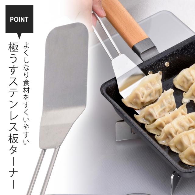 ![]() | 食材の下にスッと入り込み すくいやすい ステンレス板材でできたターナーは、食材の下にスッと入ってすくえる。ターナー部は餃子が5個乗る長さ。 |