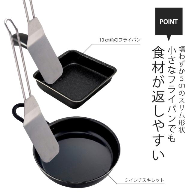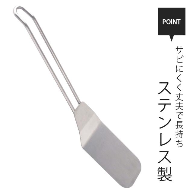 スキレットや小さなフライパンでも食材を返しやすく、すくいやすいスリム形状。ベーコンをプレスしやすいヘラ角度。丈夫なステンレス製だからアウトドアでも使える。