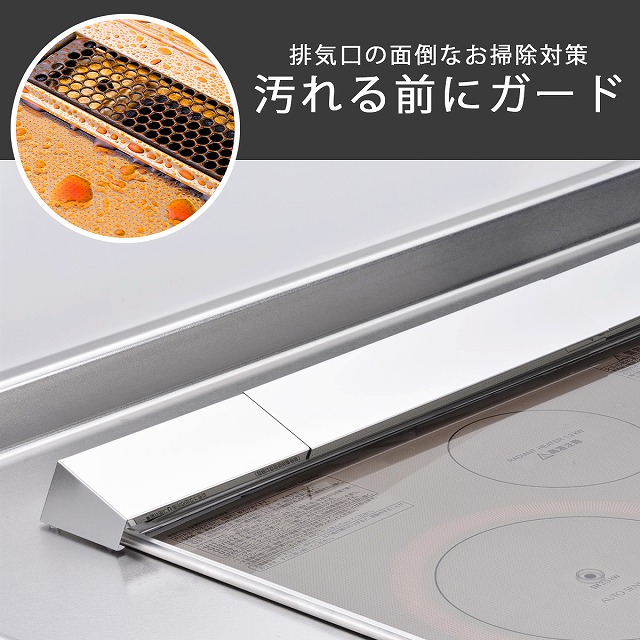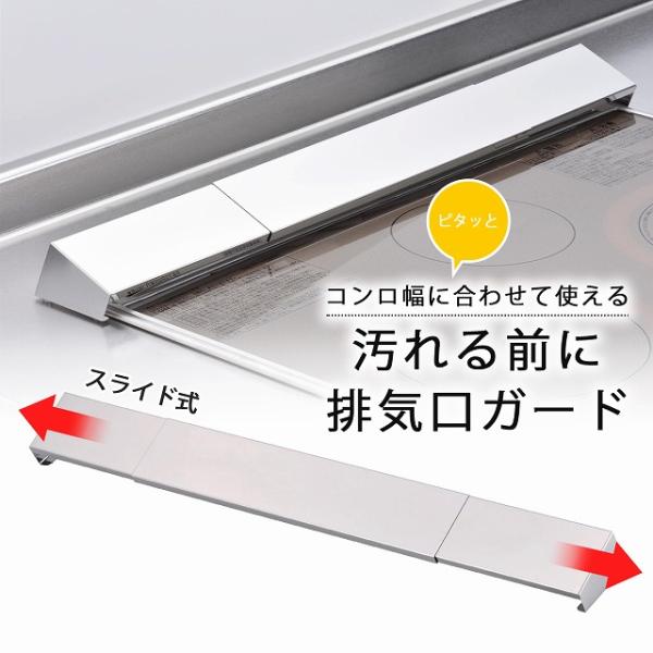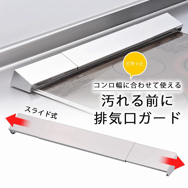 スライドしてコンロ幅にぴったり。油汚れから排気口を守る。揚げ物や炒め物の調理で飛び散る調味料や油から排気口をガード。スライドしてコンロ幅ぴったりに調整できます。一枚の材料を曲げて成形したので、接合面が無く汚れが溜まりにくい。ステンレス製なので丸洗いOK。