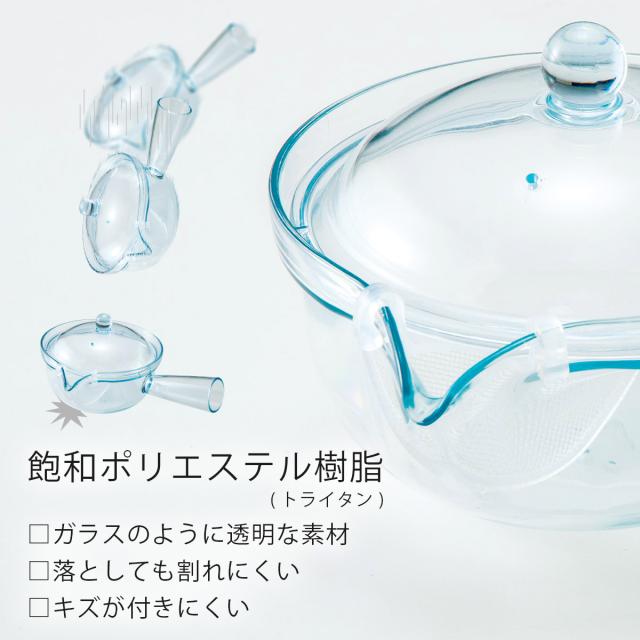 ![]() | ガラスのように透き通る 落としても割れない急須 ガラスのような透明感のある「飽和ポリエステル(トライタン)」プラスチックを使用。丈夫で耐久性に優れた素材です。他のプラスチックと比べて傷にも強く、落としても割れません。またガラス製と比べ軽量なので取り扱いも安心です。 ※強く打ちつけるように落とすとカケることがあります。 ※樹脂成型品のため取っ手側に薄いキズやくもり、注ぎ口下に線跡があります。 |