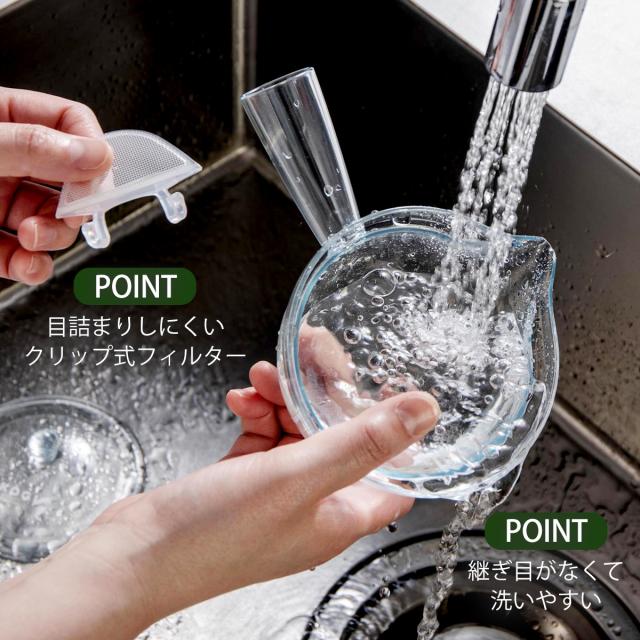 ![]() | 洗いやすくお手入れラクラク 注ぎ入れも洗浄も軽量だからラクラクです。継ぎ目のない形状で汚れもたまりにくく洗いやすい。クリップ式のフィルターは取外しかんたん。目詰まりしにくいのでサッと水洗いできれいになります。 |