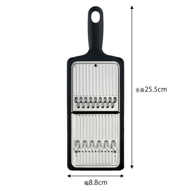 両面で千切りと太千切りの使い分けができます。大根やきゅうりの千切り、にんじんしりしりやささがきに。刃はステンレス製で丈夫です。