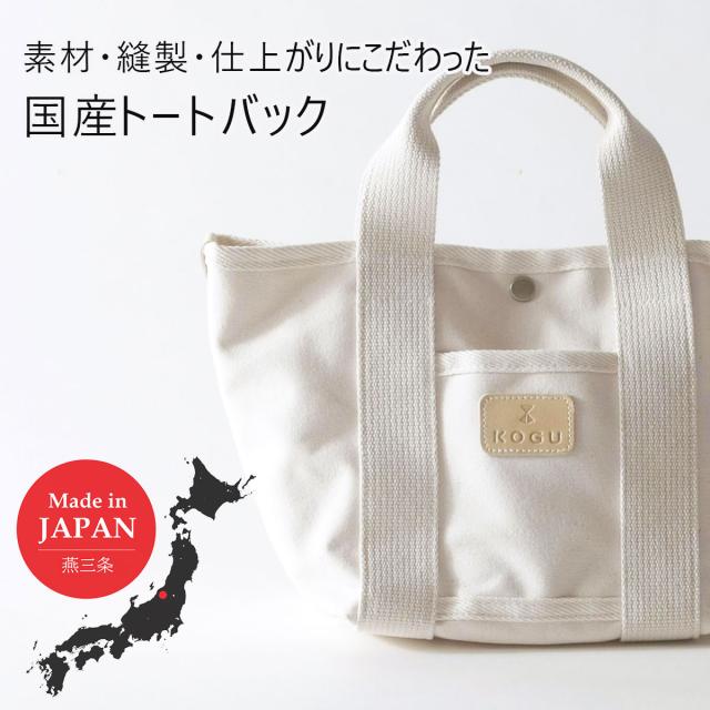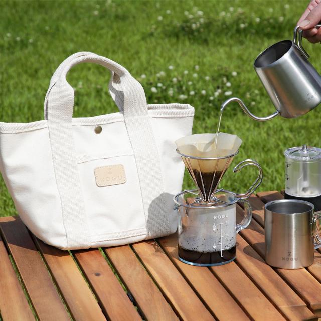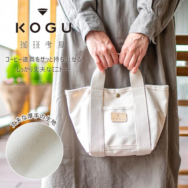 考具(KOGU)の産地、新潟県燕三条産のトートバッグ。綿100%の厚手の生地を使用して丈夫な作り。マチもしっかりあり、自立して置くことができます。珈琲考具の道具入れにぴったり。ミルがすっぽり、小物が入る内ポケットもついています。お弁当入れやお財布入れにも!