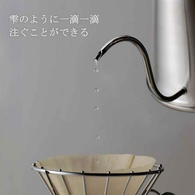 狙ったところにドリップできるポット!どんなに傾けてもほぼ垂直に注げます。細口なので湯量調節がしやすく、点滴ドリップも可能です。低い位置から注いだ時にドリッパーに当たらないように注ぎ口の長さも調整しました。ハンドルは持ちやすく傾けやすい形状です。