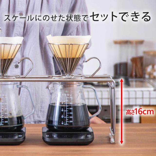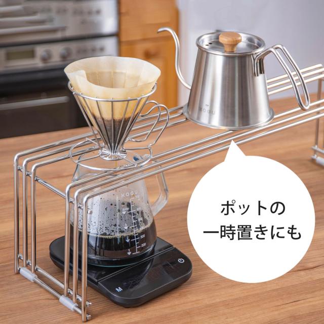 カフェのようにドリッパーを並べてコーヒーを淹れられます。最大ドリッパー5つ並べられるサイズ。太いステンレス線材を使用、シンプルでも丈夫な作り、汚れも目立ちにくく、お手入れも楽々。スケールの上にサーバーを載せてセットできる高さです。ご家庭のシンクサイズにも合わせました。コンロ脇のスペースにも置くことができ、料理中の熱いフライパンや鍋置きにも使用することができます。