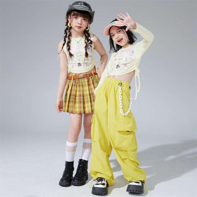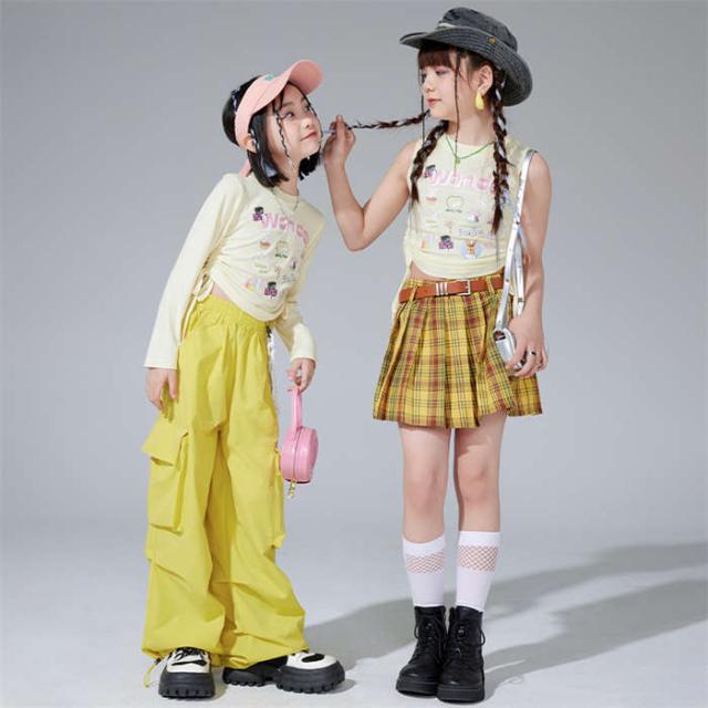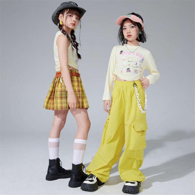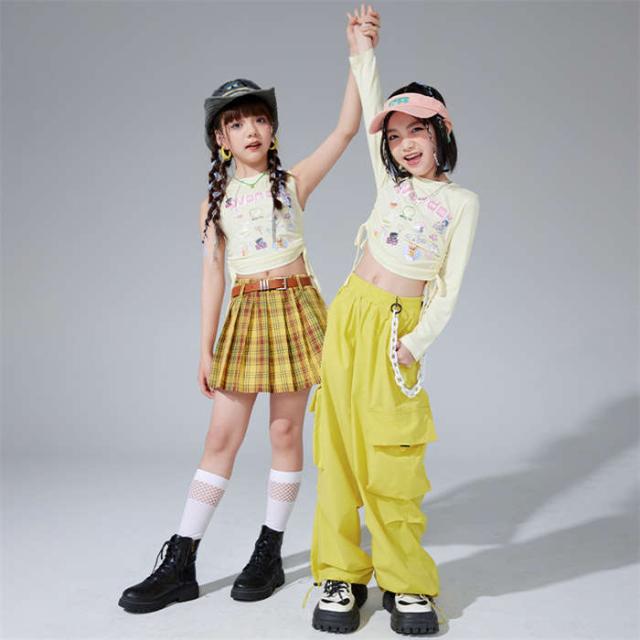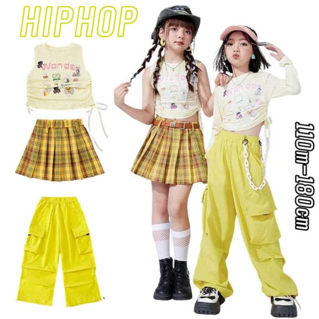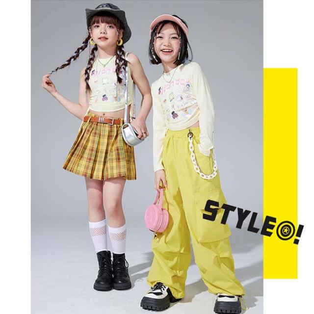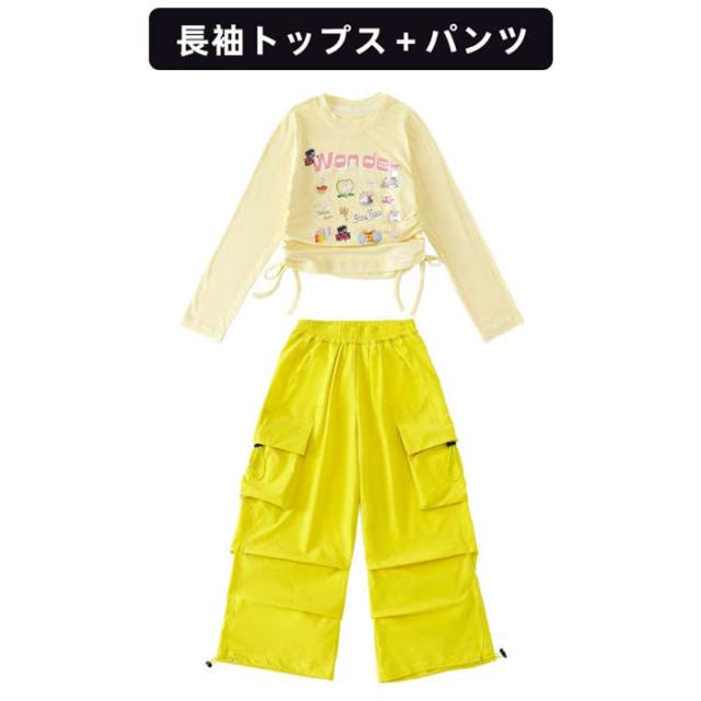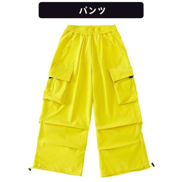 ダンスウェア 女の子 ダンス服 キッズ ダンス衣装 イエロー 黄色 へそ出しチアガール トップス タンクトップ カーゴパンツ ズボン