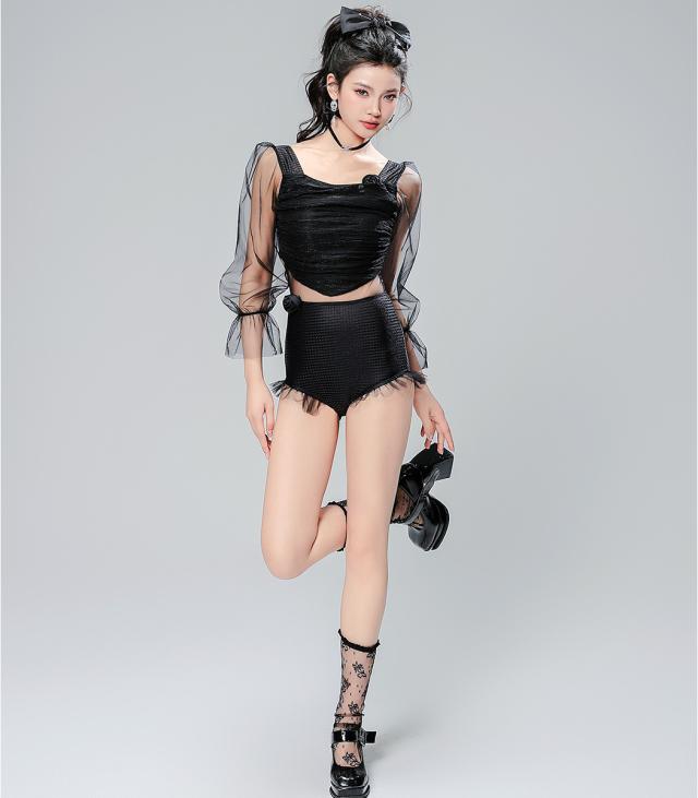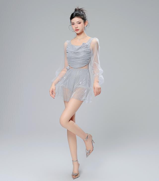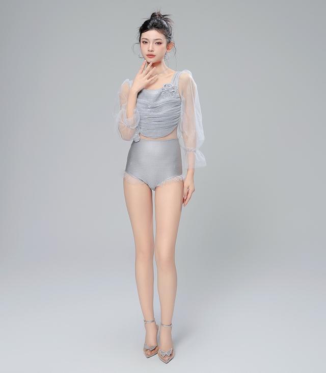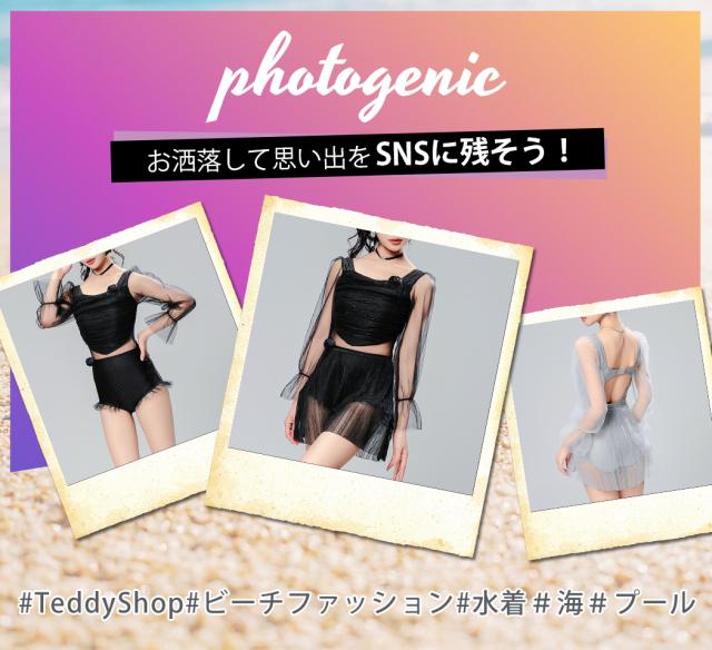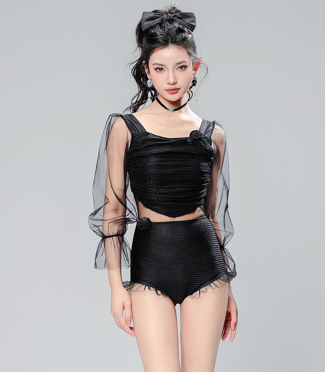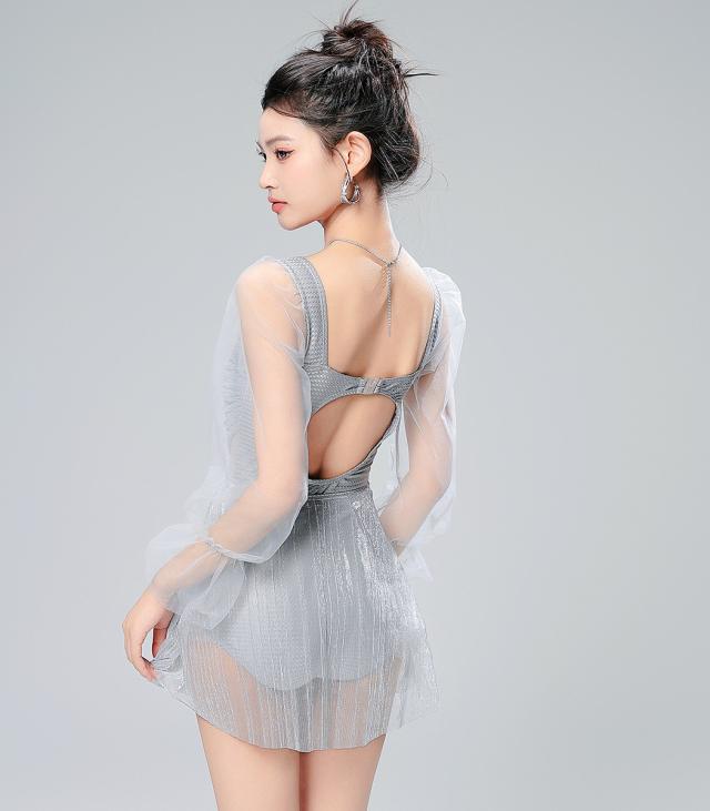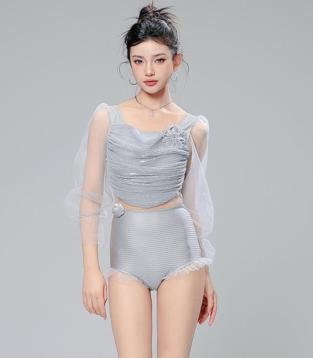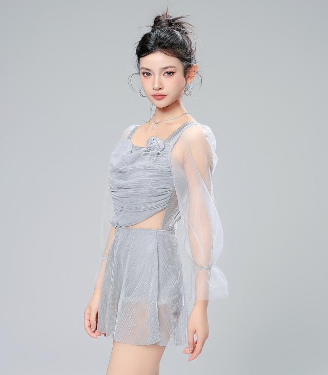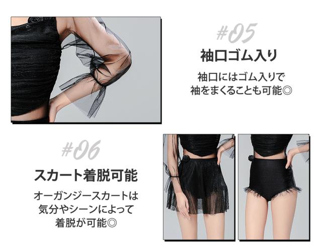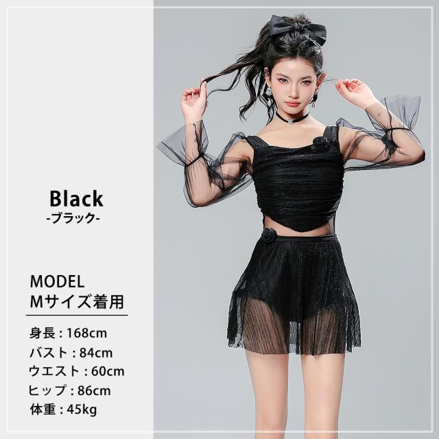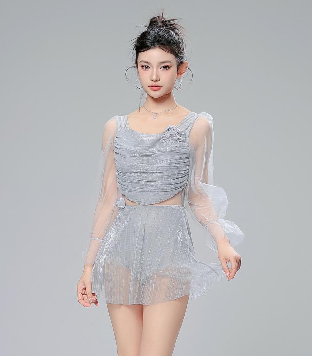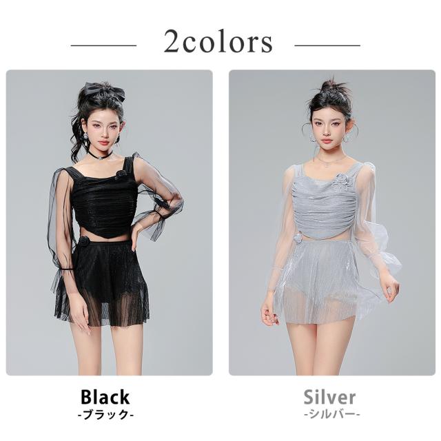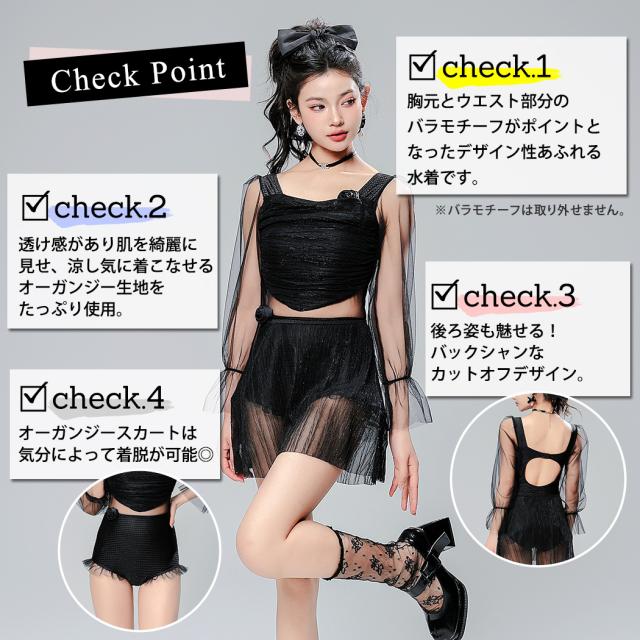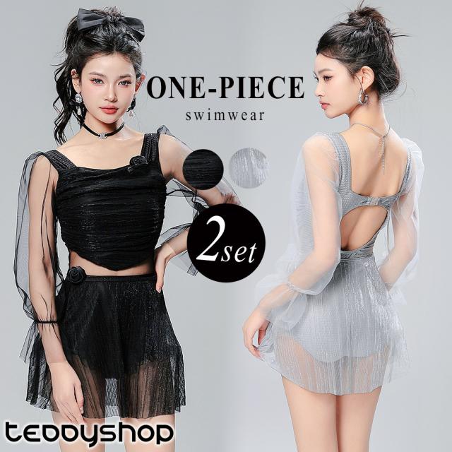 夏新作 水着 レディース 体型カバー水着 ワンピース オールインワン スカート 2点セット バラ モチーフ 飾り ビーズ 長袖 オーガンジー 袖口 フリル ゴム入り バックシャン カットオフ ベース 凹凸 ラメ 光沢 二の腕 お腹 ウエスト ヒップ