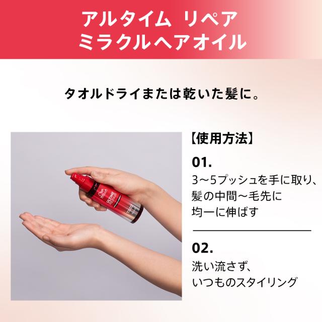 髪のキューティクルを補修し、なめらかでツヤのある髪へと導くオイルトリートメント。 熱や摩擦から髪を守り、切れ毛・広がりをおさえてまとまりやすい髪へと導きます。 ■洗い流さないヘアトリートメント / ダメージ補修 / オイルタイプ 瞬間ダメージ補修、まとまりのよいオイルタイプ。 アルタイムリペアのミストタイプでベースを整えた後の使用がおすすめです。 【スキンケアにインスパイアされた新テクノロジーを採用】 140年以上にわたり、髪の専門家として研究している科学者が、AHA(*2)とOMEGA-9(*3)を新しいテクノロジーとして開発。 毛髪内部を強化(*1)するAHAと、髪の保護機能をサポートするOMEGA-9の特別な組み合わせは、目で見て感じることができる理想的な補修を目指して作られています。 ◆AHA(*2):毛髪内部を強化 毛髪内部の結合に働きかけ、毛髪最深部の毛髪繊維に浸透するのに十分小さい有機酸で、毛髪内部を強化(*1)します。 ◆OMEGA-9(*3):髪の保護機能をサポート キューティクルの表面をコーティングし、毛髪繊維の外側に働きかけ、毛髪に含まれる脂肪酸と同一の脂質が、キューティクルの間に浸透し脂質を補い、髪の保護機能をサポートします。 *1 補修による *2 AHA-アルファヒドロキシ酸(リンゴ酸:毛髪補修成分) *3 OMEGA-9(オレイン酸:毛髪保護成分) 【使用上の注意】 ●頭皮やお肌に異常が生じていないかよく注意して使用して下さい。頭皮やお肌に合わない時、即ち次のような場合には、使用を中止して下さい。 そのまま使用を続けますと、症状を悪化させることがありますので、皮膚科専門医等にご相談されることをおすすめします。 (1)使用中、赤み、はれ、かゆみ、刺激、色抜け(白斑等)や黒ずみ等の異常があらわれた場合 (2)使用した頭皮やお肌に直射日光があたって上記のような異常があらわれた場合 ●傷やはれもの、湿疹等、異常のある部位にはお使いにならないで下さい。 ●目に入った時は、直ちに洗い流して下さい。目に異物感が残る場合は、眼科医にご相談下さい。 ●乳幼児の手の届かないところに保管して下さい。 ●可燃性であるので火気にご注意下さい。 ●室内空気を取り入れるファンヒーターを使用中の部屋で、つけたり乾かしたりしないで下さい。 配合されている揮発性成分がファンヒーターに吸入され、点火不良や消火の原因となることがあります。 |
