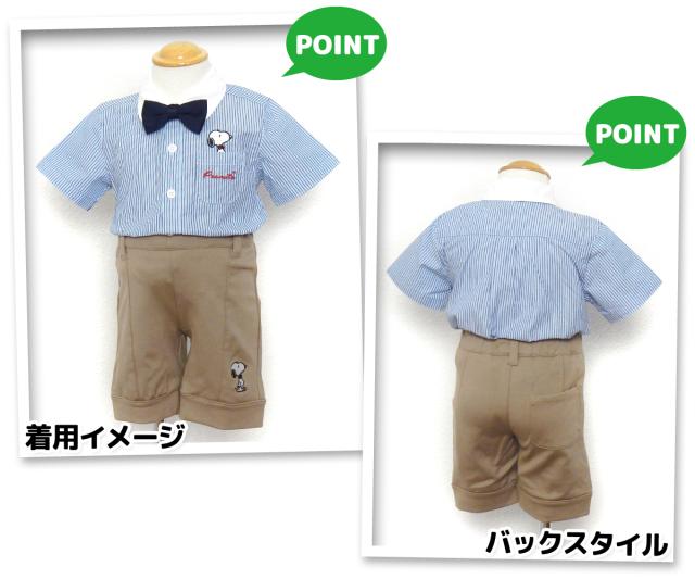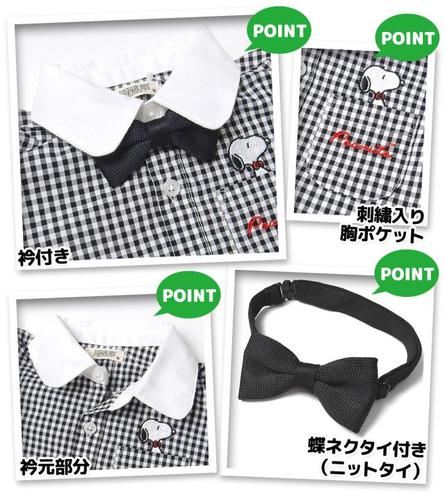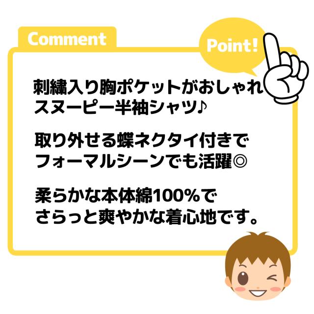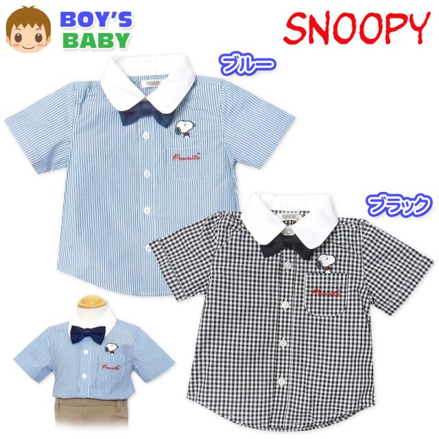 【送料無料】男児 ベビー 蝶ネクタイ付き 半袖 シャツ スヌーピー 刺繍 本体綿100% ストライプ チェック ベビー服 男の子 80cm 90cm 95cm iw-1063【メール便対応】