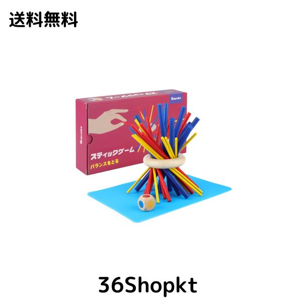 【材質・仕様】:高級な樺の木で作られ、適度な重さで手触りがとても良く、安全の塗料を採用し特殊マット仕上げで安心・安全に繋ぎます。セット内容:青スティック(大)9本、赤スティック(中)9本、黄色スティック(小)9本、木の輪1個、サイコロ1個。パッケージサイズ:23cm×10.5cm×3cm。対象年齢:6歳以上。机の上に木製バランスゲームを遊び時、置く場所の素材によって、スティックが滑り易くなることを防ぐために、滑り止めマットを用意いたしましたので、ご安心して楽しめましょう。