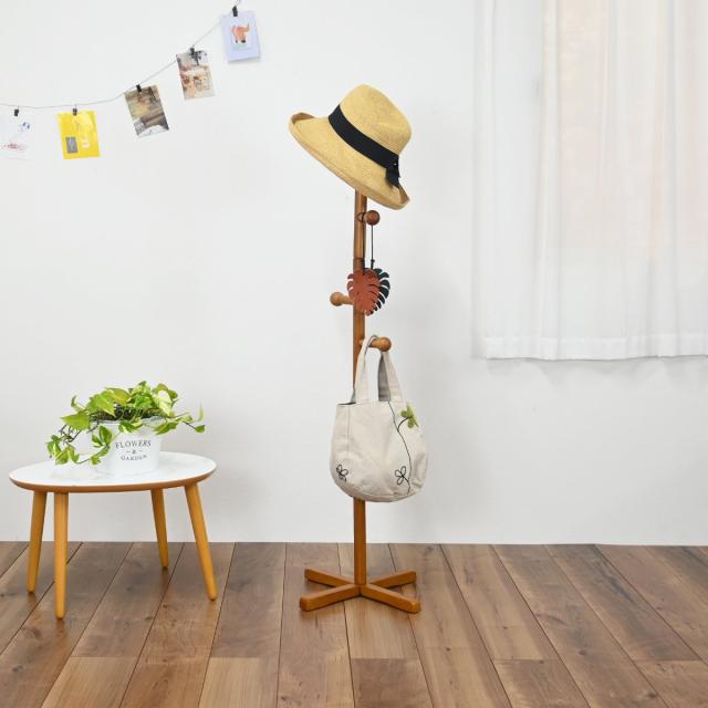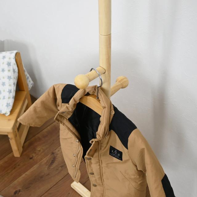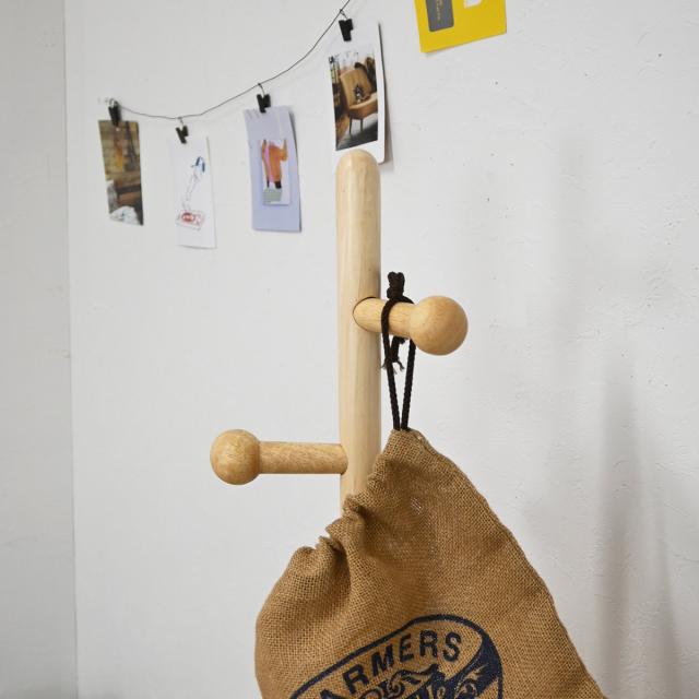 天然木を使用した、優しく温かみのある雰囲気のポールハンガーです。玄関やリビング、子ども部屋等でお出かけグッズをまとめて掛けられて便利です。