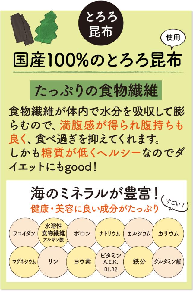 【とろろ昆布】昆布(北海道、青森県)、醸造酢 【味噌汁】国産粉末味噌、(大豆、米麹、食塩)(国内製造)、食塩、砂糖、オルニチン、ホタテエキス、しじみエキス(国産)、90種の植物発酵エキス、乾燥ネギ/調味料(アミノ酸等)、(一部に小麦・大豆・豚肉・りんご・やまいもを含む)